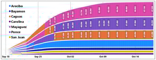 Figure 4, it is possible to quickly identify the most affected areas during the selected period using CHoLES by observing how the graph highlights the region with the highest value of CHoLES and emphasizes the region with the lowest value of CHoLES. It is interesting that, even though the region of Caguas had the greatest number of accumulated CHoLES in the first week, another region with many communities that suffered long-duration outages ended up having the most CHoLES.
