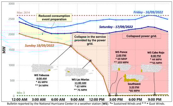 Figure 5, we observe that the impact on the electric power infrastructure can be divided into three bands. The first band is associated with decreased consumption, perhaps due to stopping normal Friday event activities to prepare for the event. The second band shows the gradual collapse of service during the event. The last band shows the collapsed power grid with very few customers served by the grid. Each band correlates with the wind conditions reported by the NHC (National Hurricane Center) in their bulletins, including sustained winds and gust winds at nearby Puerto Rican weather stations. The time of minimum consumption matches the DOE report’s time of 2:00 p.m., with 3 MW, the lowest consumption that year, reinforcing that LUMA had few customers during Fiona.