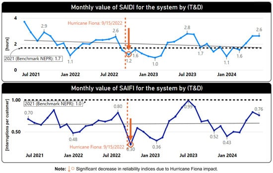 It is important to note the impact of Hurricane Fiona, which hit Puerto Rico in September 2022 (indicated by the orange arrow). Interestingly, both SAIDI and SAIFI values decrease immediately after the hurricane. This is because these indicators are designed to capture the system’s performance under normal operating conditions, excluding the effect of major force events like hurricanes. By excluding the impact of Hurricane Fiona, the indicators show an apparent improvement, highlighting the need for complementary metrics.