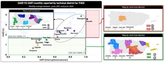 7]. In contrast, the technical district of Guayama, which encompasses seven municipalities, demonstrates superior performance by maintaining values below the benchmarks in 89% of the analyzed months. This implies that, during the specified period, Guayama recorded fewer than one service interruption per month and an interruption duration consistently under 1.7 h.