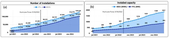 The development of PV systems with BESSs has experienced explosive growth in Puerto Rico. As of June 2024, there were 101,642 energy storage systems reported as installed across the island. Considering the total number of customers, namely 1,511,070 [