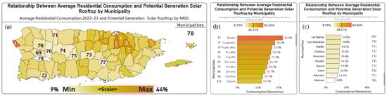 Figure 9 shows the relationship between average residential consumption (2022–2023) and potential generation of solar PV rooftops. This map makes it possible to recognize that the residential consumption by municipality is possible to supply with the PV rooftop solar energy, requiring between 9% and 44% of potential generation for PV rooftops. The table in the figure uses established numbering. The top ten are 1 to 10 (Rincón until Caguas), and the bottom ten are 69 to 78 (Las Marias until Maricao).