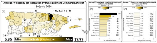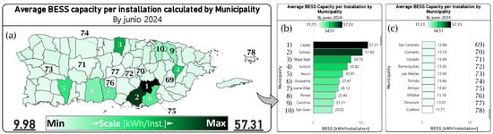 Figure 11, the municipality reports the number and capacity of systems. The average BESS capacity per installation calculated by the municipality allows for the identification of the municipalities with a tendency to install batteries with higher or lower capacity. The maximum ratio of PV capacity per installation calculated by the commercial district indicates which area of the island has the most extensive rooftop PV solar systems installed. This is complemented by the BESS capacity-to-installation ratio calculated by the municipality, which shows where the largest BESSs are on the island. The most extensive PV solar system is installed in the island’s north, while the most extensive BESSs are installed in the south. One possible explanation for this is that municipalities like Cayey and Salinas have relatively few customers but a higher percentage of industrial and commercial systems with BESSs. The right side of