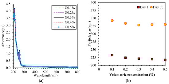 Beer–Lambert’s law suggests that a higher absorbance intensity indicates stability in nanofluids. Surfactant lowers the surface tension and prevents the graphene sheets from sticking together. A UV–visible absorption analysis of nanofluids shows steady sedimentation over time, with UV–vis spectroscopy used to monitor solution absorption changes. A 1:20 ratio was diluted in water to provide optimal light transmission for all samples. After one day, the particles in the 0.05 vol% nanofluid measured 232.1 nm, and after thirty days, they measured 343.3 nm. The average particle sizes of G0.05 wt% and G0.3 wt% exhibited a more pronounced difference. Following one day and thirty days of dispersion, the results for G0.1 vol% were 234.2 nm and 313.3 nm, whereas the values for G0.2 vol% were 223 nm and 334 nm, as presented in Figure 3. These measurements were 224.6 nm and 303.4 nm in the case of G0.3 vol%. A suspension was more stable when a 0.3 vol% nanofluid was dispersed than when the nanofluid was utilised. The most significant peak shows the presence of graphene platelets for G0.3% at 250 nm. Compared to other nanofluids, the 0.3 vol% nanofluid produced extremely high stability findings.