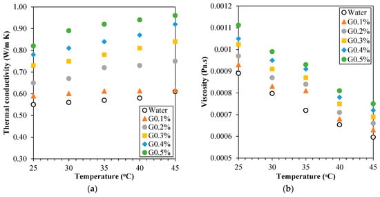 From Figure 4a, it can be seen that thermal conductivity increases with temperature. The reason is that Brownian motion improves, particles and fluids interact better, and phonons move more quickly. The growth rate, on the other hand, relies on things like the quantity of nanoparticles, the features of the base fluid, and how well the graphene particles are spread out. More graphene nanoplatelets in the base fluid make them contactless-resistant, which makes it better at conducting heat. As the nanofluid’s temperature rises, the nanoparticles’ kinetic energy also increases, leading to significant vigorous Brownian motion, which can improve the micro-convection within the fluid. Enhanced heat transfer between the nanoparticles and the base fluid is facilitated by increased motion. Nanofluid stability presents a significant challenge at elevated volume concentrations; the research [4,6,46,47] demonstrates that low-weight graphene concentrations are preferable. Graphene nanofluids G0.1%, G0.2%, G0.3%, G0.4%, and G0.5% have been reported to exhibit increases in thermal conductivity of 7.36%, 26.35%, 36.85%, 47.38, and 61.5%, respectively. High-energy free electrons at elevated temperatures, frequent collisions, and the crystalline arrangement of liquids enhance thermal conductivity. Graphene sheets possess a structure that enhances the surface area and facilitates heat transfer within graphene nanofluids by moving free electrons and phonons. G0.5% nanofluid has a thermal conductivity of 61.4% at 318 K, which is 12% higher than at 298 K.