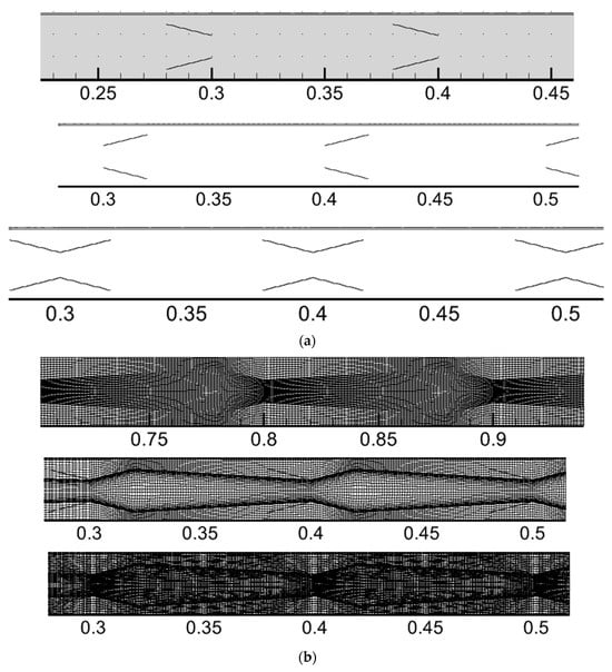 The computational model, i.e., a circular pipe without inserts and convergent or divergent nozzles, is generated using ICEM CFD. The present work considers two cases: convergent and divergent nozzles placed at 100 mm throughout the pipe. The pipe has a diameter of 28.6 mm, a pipe thickness of 0.6 mm, and a length of 2600 mm. The nozzle diameters are 10 mm and 20 mm, and their length is 20 mm. The non-uniform structured mesh is generated using ICEM CFD software(Version 19.0), and near pipe wall boundary layer growth is created to capture turbulent features. It is observed that the generated mesh has a quality between 0.95 and 0.98. The geometry modelling of the convergent nozzle (CNi), divergent nozzle (DNi), and convergent–divergent nozzle (CDNi) inserts are presented in Figure 6a, and their meshes are presented in Figure 6b.