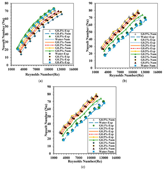 The average Nusselt number variation with Reynolds number for various graphene nanofluids is investigated using two passive techniques: a convergent nozzle insert (CNi) and divergent nozzle insert (DNi). The analysis encompasses experimental and numerical simulations, demonstrating a close alignment, thereby validating the simulation model, as shown in Figure 7. The results demonstrate a consistent rise in the Nusselt number as Reynolds numbers increase, regardless of the passive technique. This phenomenon arises from heightened turbulence at elevated Reynolds numbers, which disturbs the thermal boundary layer and improves heat transfer. Graphene nanoparticles improve the Nusselt number due to their exceptional thermal conductivity, which aids in better energy transfer within the fluid.