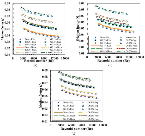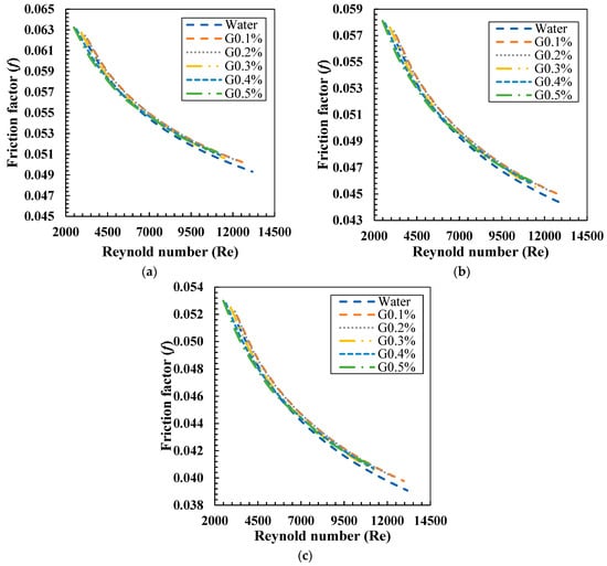 Numerical simulations demonstrate the correlation between the friction factor and the Reynolds number for pure water and graphene nanofluids across different volume concentrations. This analysis investigates the impact of inlet temperatures (35 °C, 40 °C, and 45 °C) in conjunction with a CDNi insert, highlighting the correlation between these factors and flow resistance, as depicted in Figure 10. The friction factor generally diminishes as the Reynolds number increases, indicating a transition to turbulent flow, where inertial forces dominate over viscous forces, thereby reducing the relative influence of wall friction. Graphene nanofluids exhibit greater friction compared to water across all Reynolds numbers. The increase results from the higher viscosity of nanofluids containing suspended graphene particles, which produces more shear stress next to the tube wall. As the input temperature rises from 35 °C to 45 °C, a little decrease in the friction factor is seen. This results from the temperature-dependent drop in fluid viscosity, which decreases flow resistance and the friction factor. At elevated temperatures, the fluid’s viscosity decreases, promoting a smoother flow and resulting in a slightly reduced friction factor. The CDNi insert has a pronounced impact on the friction factor across all fluids and temperature ranges.