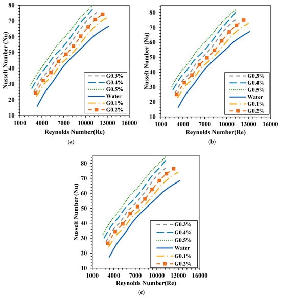 Nusselt number for CNi insert case: (a) water, (b) G0.1%, (c) G0.2%, (d) G0.3%, (e) G0.4%, (f) G0.5%.