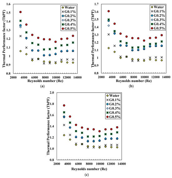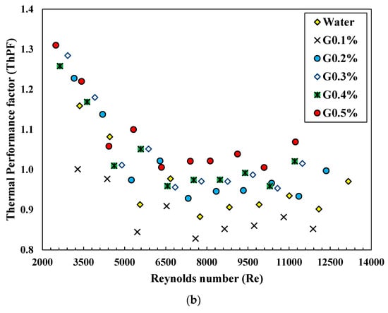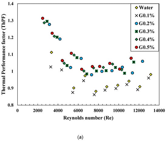 The highest thermal performance factor is 1.313, achieved by G0.5 vol% nanofluid when the divergent nozzle insert receives fluid at the laminar region. The effect of CNi and DNi inserts can be seen as significant on the performance of the heat exchanger, as shown in Figure 11. It can be perceived that the ThPF range is observed as 0.98–0.99 and 0.97–1.01 for the convergent nozzle insert and divergent nozzle insert, respectively, when the fluid is water. These values are enhanced to 0.97–1.24, 0.98–1.23, 1.04–1.19, and 1.15–1.298 for G0.1%, G0.2%, G0.3%, G0.4% and G0.5%, respectively, when the tube employs the CNi insert. The thermal performance factor exceeding one suggests that the enhancement of heat transfer from the tube is more significant than the increase in friction, and the opposite holds true as well. The performance factors for the divergent nozzle are more significant at the same Reynolds number and decrease with an increasing Reynolds number.