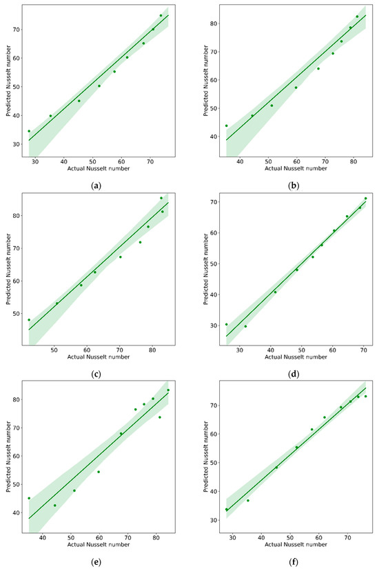 The inferences from the test demonstrated that the nanoparticle concentration enhances the Nusselt number along with the flow rate. The data were used to develop a prediction model using SVR and RF techniques. Initially, 80% of the test data was used for all techniques model training, and the training outcomes are recorded as follows. Figure 13 demonstrates the best comparison among most data points between actual values and values predicted using the model. The values are approaching the best-fit line, resulting in a firm prediction.