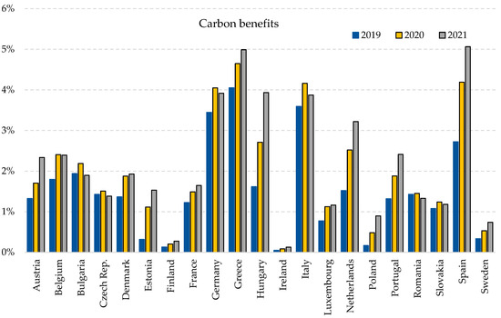 - CIEPi—carbon intensity of energy production, i.e., the amount of carbon dioxide emitted per unit of energy production (of all fossil fuels), measured in tonnes of CO2 per 1 MWh in the i-th country. The economy of each country is characterised by a different level of energy efficiency, and thus the emission intensity of energy production. Knowing what the carbon intensity of energy production is, and knowing the amount of energy from PV that replaces fossil fuels, thanks to CIEP, we are able to determine potential reductions in carbon emissions;