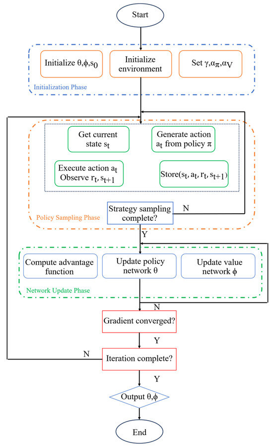 The A2C algorithm (Advantage Actor-Critic) optimizes electric vehicle charging schedules in the power system by leveraging the collaboration between Actor and Critic networks to track and eliminate renewable energy curtailment. The main advantage of the A2C algorithm lies in its stability and high efficiency, especially in continuous action space Outstanding performance. Compared with the traditional Q-learning algorithms, A2C uses the dominant function to reduce the volatility of the Q-value estimation and avoids the instability problem in the policy update [28,29]. In addition, A2C, as an algorithm for simultaneous updating, has a simpler structure and is implemented with lower computational overhead, which makes it particularly suitable for real-time optimization in the complex environment of EV scheduling [30]. The following is a specific flow for implementing the A2C algorithm, combining the steps of value network update, policy network update, and real-time scheduling optimization.