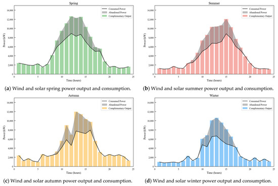 In this paper, the typical scenario output and load data from a region in Jilin Province are selected for analysis. The tariff for electricity purchased by users from the grid in this region in 2022 is 0.55 RMB/kWh. In this context, this section considers three modes of renewable energy consumption by electric vehicles. These are (1) tracking and consumption of renewable energy in wind power mode; (2) tracking and consumption of renewable energy in photovoltaic mode; (3) tracking and consumption of renewable energy in wind–solar complementary mode. Figure 4, Figure 5 and Figure 6 show the output, consumption, and abandonment distribution of renewable energy in different seasons for all three modes.