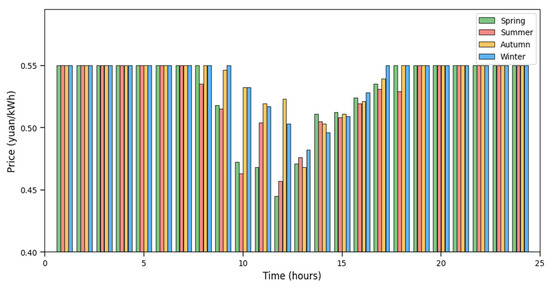 The reward function of the A2C algorithm is constructed in the upper Stackelberg game based on Equations (12)–(17) to quantify the impact of electricity price on load regulation and revenue, while Equations (25)–(33) are used to design the A2C iterative network, combining the load response with the tariff strategy to perform multiple rounds of optimization iterations. After 2000 iterations and 6 h of computation, the optimal time-sharing tariff strategies in different modes are obtained respectively: (1) The optimal time-sharing tariff of REG in wind power mode is shown in Figure 7; (2) the optimal time-sharing tariff of REG in photovoltaic mode is shown in Figure 8; and (3) the optimal time-sharing tariff of REG in wind and solar complementary mode is shown in Figure 9. These time-sharing tariff strategies provide accurate price signals for EVA to guide their rational scheduling of charging and discharging behaviors.