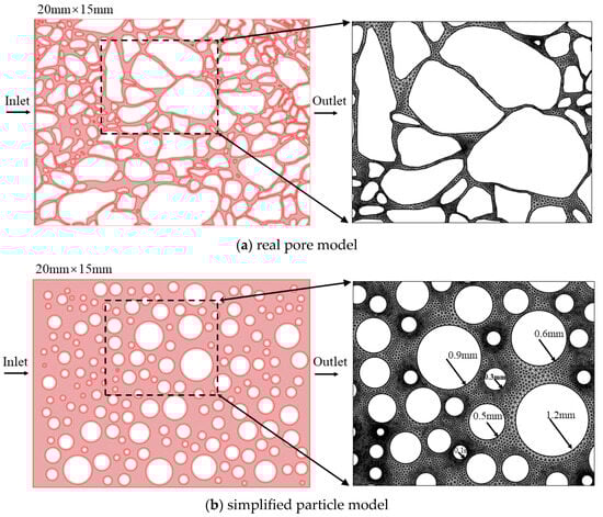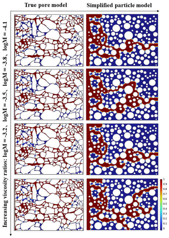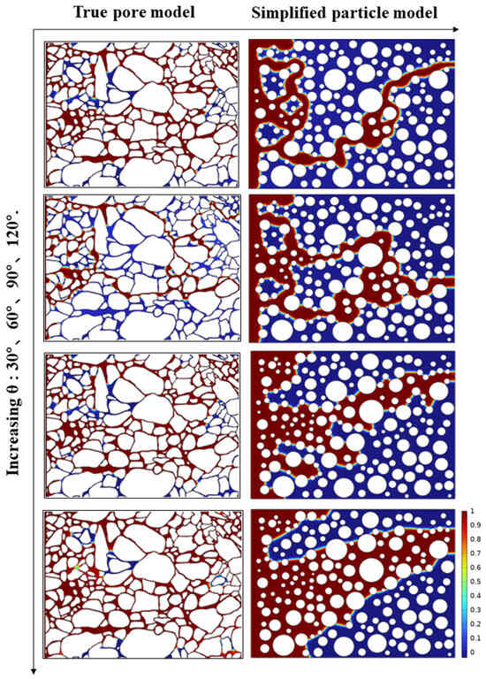- Rokhforouz, M.R.; Akhlaghi Amiri, H.A. Effects of grain size and shape distribution on pore-scale numerical simulation of two-phase flow in a heterogeneous porous medium. Adv. Water Resour. 2019, 124, 84–95. [Google Scholar] [CrossRef]