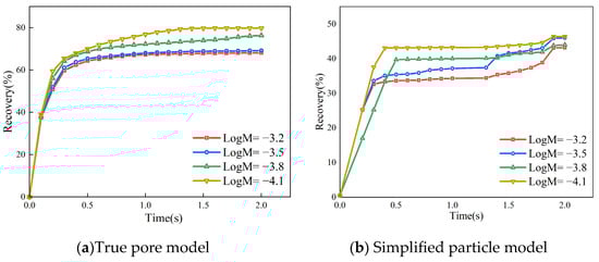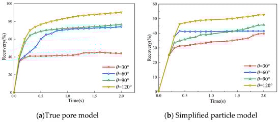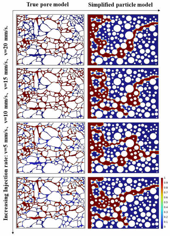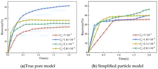 - In the simulation results of the real pore model and simplified particle model, the diffusion details of CO2 displacement process have changed significantly. There are differences in the shape of pointing, the number of dominant flow channels, the sensitivity to influencing factors, and the ultimate recovery efficiency. In the simulation results of the simplified particle model, the number of dominant CO2 flow channels decreased, and the overall recovery efficiency decreased. It is less sensitive to capillary number, rock wettability, and other factors.