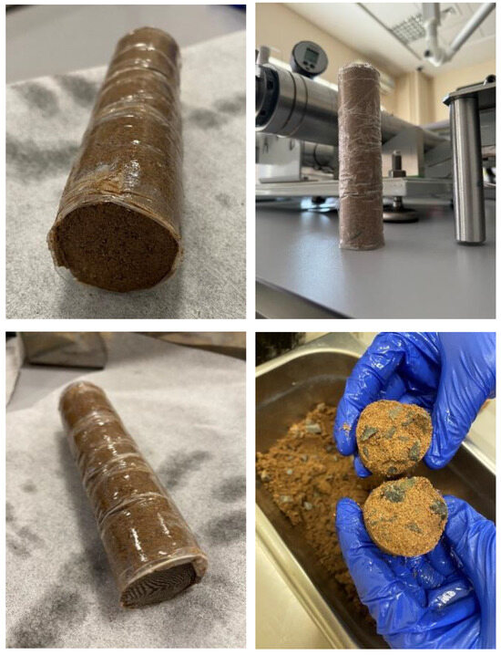 Then, to facilitate the molding of the sample, a small quantity of water was added to the mixture. Subsequently, the mixture was poured into a plastic mold and consolidated inside a steel tube using a three-ton hydraulic jack.