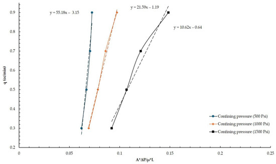 The obtained results enable us to compare the obtained permeability coefficient at different confining pressures. Permeability and confining pressure are clearly linked at all flow rates, with permeability decreasing as confining pressure rises. The dashed lines correspond to the linear trendline for each set of confining pressure measurements. For example, a permeability of 55.2 md was measured for the first set of fault gouge material samples at a 500 psi confining pressure. By increasing the confining pressure to 1000 psi, which is double the increase, the permeability fell by about 2.6 times to 21.6 md. In general, permeability dropped as the confining pressure increased. Interestingly, permeability only declined twice, reaching 10.6 md, when the confining pressure increased from 1000 psi to 1500 psi.