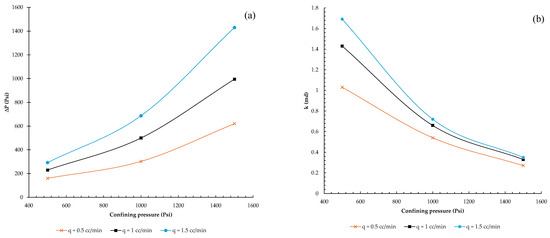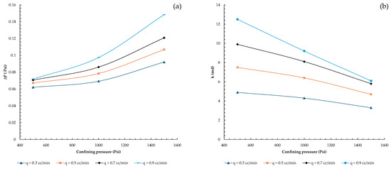 Figure 7, the second set of fault gouge samples exhibited similar behavior, with permeability variation becoming insignificant under elevated confining pressures determined at 1500 psi. At first, it was thought that the sample’s permeability should not be considerably altered by changes in flow rate. The injection flow rates in the first set of fault gouge samples ranged from 0.3 to 0.9 cc/min at intervals of 0.2 cc/min. When the effluent was studied following the trials at various confining pressure levels and flow rates, the fault gouge composition remained constant and comparatively stable with no fine migration towards the outlet. Therefore, the injection flow rate intervals were raised to 0.5 cc/min and adjusted from 0.5 cc/min to 1.5 cc/min to observe the influence of the flow rate in the second set of tests (second batch of fault gouge samples).