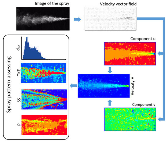To perform a multiparametric qualitative analysis of the spray swirl pattern, the diameter d32 and the three derivatives of the aerosol velocity determined by the PIV method (both the resultant velocity defined as V and its components u and v) were used: turbulent kinetic energy (TKE); swirl strength (SS); and spray pressure (P). In the calculations, the TKE (Equation (3)) was computed from the sum of variance (Equation (2)) obtained from mean velocities (Equation (1)), as shown below [56]: