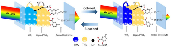 - Sarwar, S.; Park, S.; Dao, T.T.; Lee, M.S.; Ullah, A.; Hong, S.; Han, C.H. Scalable photoelectrochromic glass of high performance powered by ligand attached TiO2 photoactive layer. Sol. Energy Mater. Sol. Cells 2020, 210, 110498. [Google Scholar] [CrossRef]