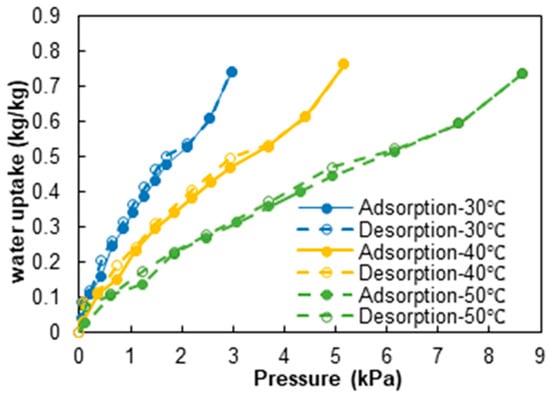 The water uptake, sorption heat, and sorption enthalpy under different operating conditions are summarized in Table 1. The difference between sorption heat and sorption enthalpy is that the former is the heat released per unit mass of sorbent, whereas the sorption enthalpy is the heat released per unit mass of water exchanged. The range of obtained sorption enthalpy was 2307–2633 kJ/kg H2O under various operating conditions. The sorption enthalpy slightly increased with the increased desorption temperature. It is possible to notice that for the conditions tested, the actual sorption amount processed ranged between 0.23 and 0.29.