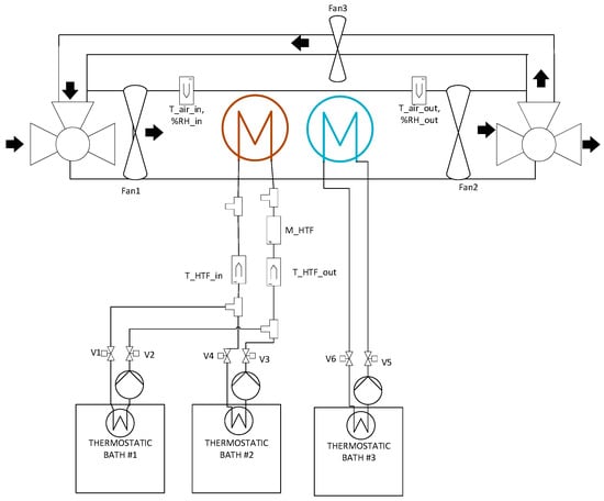 The HEX was tested in a dedicated bench specifically developed at CNR. The P&ID of the system is shown in Figure 2, whereas some pictures are shown in Figure 3. It mainly consists of a metallic duct, inside which the HEX under test is installed; two thermostatic baths for providing the temperature levels for adsorption and desorption; all the needed sensors; and the data acquisition system. The main duct also includes two tees at the inlet and outlet and a flexible pipe to allow air recirculation, and therefore better adsorption, to compensate for the dynamics of the material. The opening/closing of this branch is realized by means of automatic flow regulation valves equipped with stepper motors. The reason for the selection of such a configuration lies in the limitations of the actual sorption capacity measured when passing from material-scale to lab-scale adsorption in open systems. Indeed, the main cause for limited adsorption is the process dynamics, especially when using the selected composite material. This phenomenon was already highlighted in [29]. In adsorption wheels, this is mitigated by multiple recirculations of the air while the wheel is rotating. The proposed solution for the system tested in the lab was instead to add the recirculation pipe.
