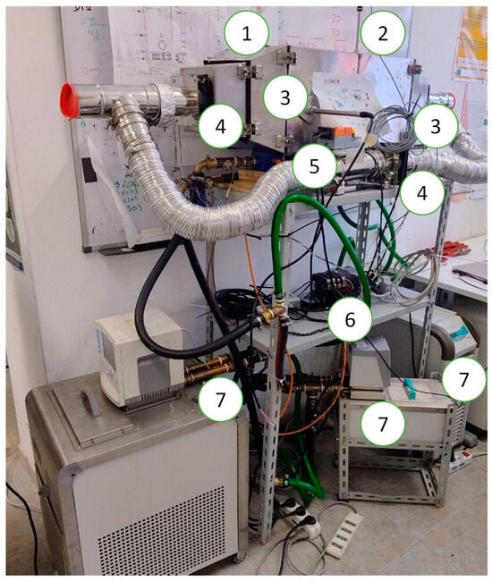 Testing rig for the heat exchangers for deep dehumidification: 1—main duct; 2—air velocity sensor; 3—thermo-hygrometers; 4—fans; 5—automatic valve; 6—data acquisition system; 7—thermostatic baths.
