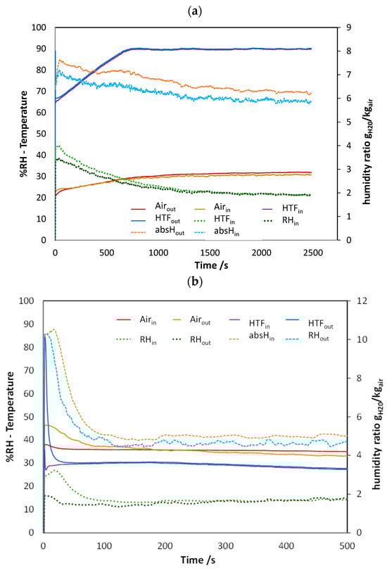 An example of the dynamic trends for desorption and adsorption measured during tests is given in Figure 4. It is worth mentioning that the notations “absHin” and “absHout” refer to the humidity ratio, which was calculated using CoolProp from the air temperature and air relative humidity. For the desorption process (Figure 4), it is possible to notice that as soon as the connection to the thermostatic bath with the high-temperature HTF is open, the humidity at the outlet increases, which is due to the water vapor released by the sorbent. It is interesting to notice what happens in more detail by looking at the orange and light blue curves, which represent the humidity ratio. It is clear that the majority of desorption occurs, more or less with a constant rate, for 500 s. The constant rate is due to the linear increase in the temperature of the HTF during this period: considering the shape of the isosters of Siogel in this range, this is in line with the theoretical expectations. After 1000 s, the material released almost all the water vapor and therefore, the inlet and outlet humidity ratios achieved the same value. To be more specific, after 1200 s, the %RH outlet was identical to the %RH in. This is due to the increasing temperature of the air within the wind tunnel (yellow line in the picture), which is heated by the material, which reached 85 °C.