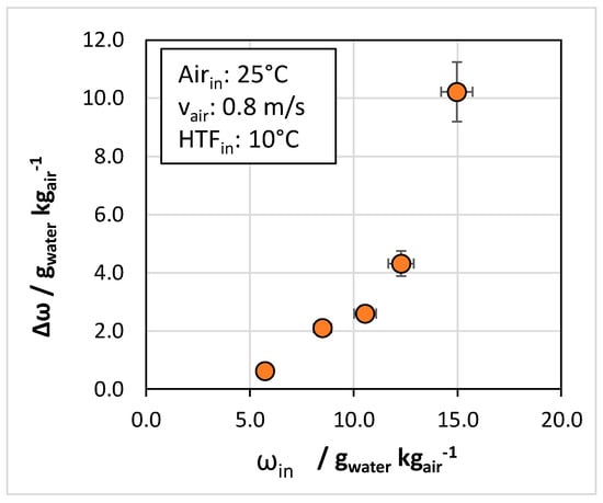 Figure 8 and Figure 9 show the results of the tests carried out at different inlet temperatures of the HTF. Indeed, it is well known that the adsorption capacity increases with the reduced temperature of the adsorbent, which translates, from an engineering perspective, into a lower temperature for the cooling fluid. As will be better explained in the next section, a dedicated analysis was carried out to verify that the cooling of the sorbet occurs in a short time to ensure that the adsorption heat is properly dissipated. The results in Figure 8 refer to the reduction in the humidity ratio as a function of the HTF inlet. The better results are achieved for an inlet temperature of 10 °C with a quadratic reduction. Above 20 °C, a plateau is reached. HTF inlet temperatures above 20 °C were investigated since they correspond to the case where water at ambient temperature can be used for cooling without the need for extra energy expenses for producing chilled water. However, it is clear that compared to the case of HTF inlet of 10 °C, when Δω = 7 g/kg was achieved, temperatures above 20 °C only allowed Δω = 4 g/kg, i.e., 40% lower adsorption capacity.