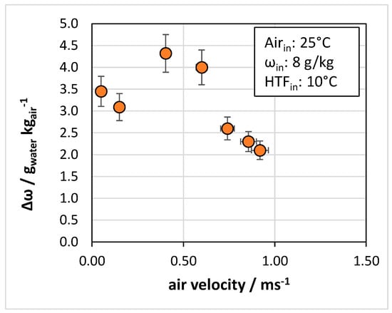 The operating conditions investigated were the effect of air velocity and the temperature of the heat transfer fluid (HTF). Figure 6 presents the effect of air velocity on the achievable reduction in the humidity ratio. The trend shows a first increase in the achievable Δω when passing from 0.1 m/s to 0.4–0.6 m/s and a subsequent decrease afterward. This trend can be explained by considering that for very low velocities of the air, the proper passage of air in the HEX was not fully achieved, especially in areas where there was a thicker layer of the sorbent, as will be detailed in the next section. However, when the air velocity was too high, i.e., >0.6 m/s for the present case, the contact time between the air and the sorbent was not sufficient for the adsorption process.