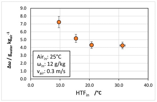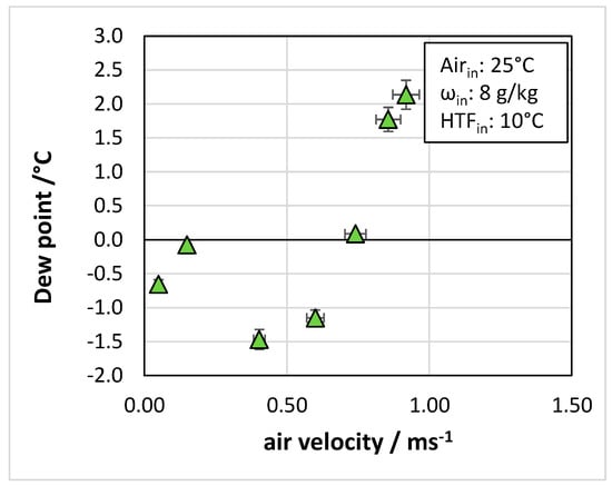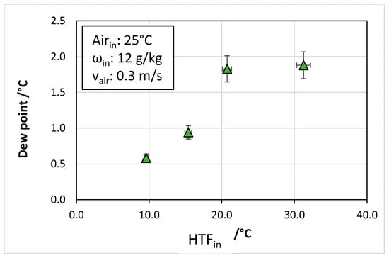 The same trend is observed for the dew point of the outlet air, reported in Figure 9: whereas for an HTF inlet of 10 °C the dew point was 0.5 °C, for the temperatures above 20 °C the dew point increased to 2.0 °C.