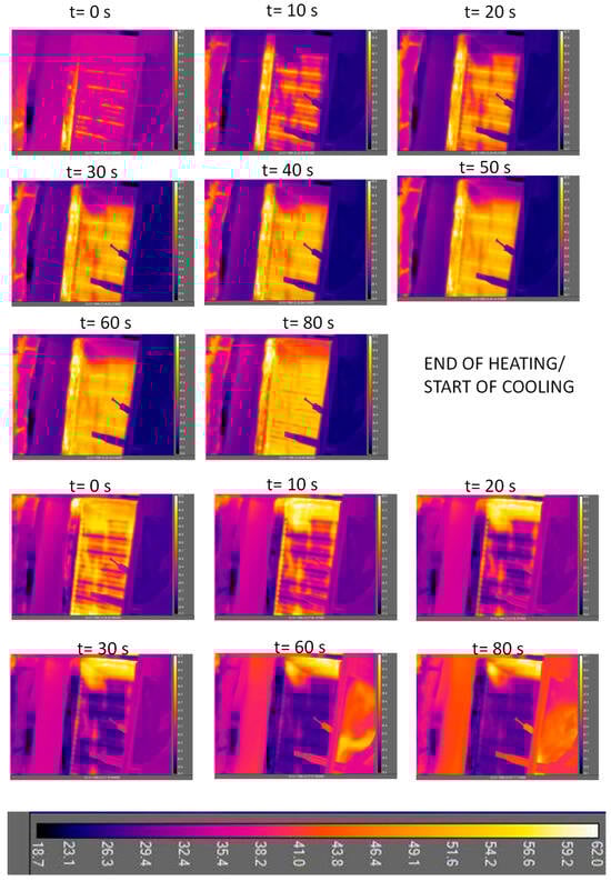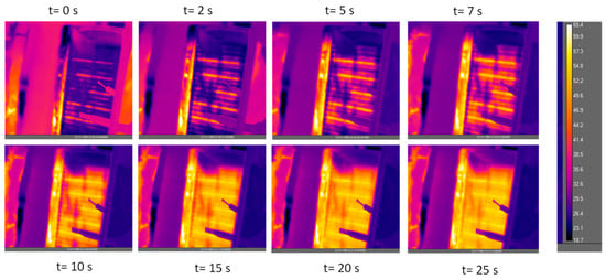 Afterward, an entire cycle was recorded with the IR camera. Adsorption was carried out at 20 °C and desorption at 70 °C. Some pictures from the IR camera are shown in Figure 11. The main considerations that can be drawn are that the full heating of the HEX with the material requires 30 to 50 s and the complete cooling of the HEX requires 30 to 60 s. Such values can be considered acceptable since they are less than 10% of the overall time for adsorption/desorption.