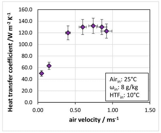 The operating parameter yielding the largest influence on the heat transfer coefficient is the velocity of air since it affects the heat exchange on the air side. The effect of air velocity on the heat transfer coefficient is shown in Figure 14 for the same set of tests presented in Figure 6. It is possible to notice that for very low air velocities, the heat transfer coefficient is in the range of 50 W/(m2 K), whereas it increases to approximately 130 W/(m2 K) for velocities of 0.4 m/s and above. It remains constant with increased velocity once this limit has been reached due to the intrinsic characteristic of the sorbent material, which has a thermal conductivity of 0.2 W/(mK), and to the non-optimal distribution of airflow inside the channel, which was not specifically studied from the fluid-dynamics perspective. Overall, the UA values measured are in the range of 80–130 W/K, which is approx. 25% higher than the average values for commercial finned flat tube HEX reported in [28], thus indicating a good efficiency of the heat exchanger compared to the state of the art.