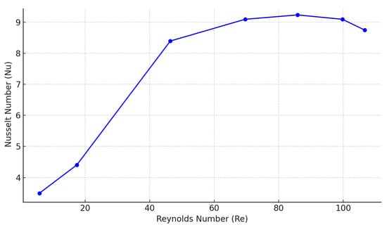 However, as can be noticed from the comparison between Figure 14 and Figure 6, even if at higher air velocities the heat transfer coefficient is more or less constant, this does not correspond to an increased sorption capacity. As previously mentioned, this is partly due to the dynamics of the adsorption process, but it might also be ascribed to fluid dynamic reasons. For the tested conditions, the correlation between the Reynolds number and the Nusselt number was calculated and it is shown in Figure 15. The curve shows an initial increase in Nu with Re, followed by a plateau starting around Re ≈ 70–100, which corresponds to air velocities of 0.75 to 0.80 m/s. This behavior indicates the onset of a heat transfer performance limit, likely due to geometric and flow constraints of the heat exchanger.