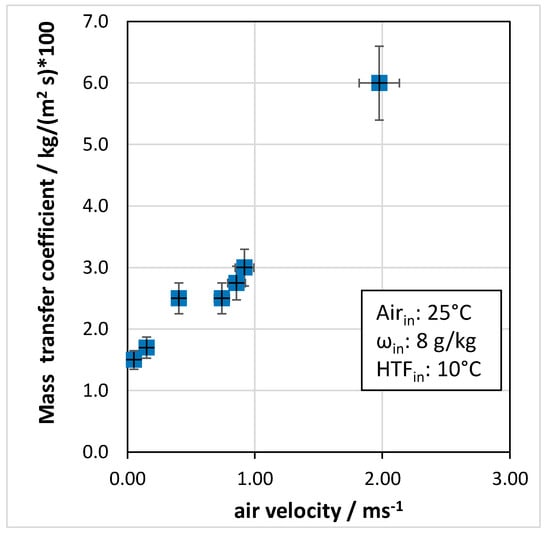 Figure 16 shows the effect of air velocity on the mass transfer coefficient. There is a clear improvement in the mass transfer coefficient with air velocity, as remarked by the test carried out at 1.98 m/s. However, as previously mentioned, increasing the flow rate of air does not allow for a proper time of contact between the air and the adsorbent, and, as a final result, this reduces the sorption capacity. Considering the tests in the range of 0.1 to 1 m/s, it is possible to notice that the mass transfer coefficient is in the range of 0.025–0.035 kg/(m2 s), which is twice the value reported for the packed bed heat exchanger in [23]. This further remarks that the design of the HEX is suitable and that an advancement compared to the state of the art has already been achieved.