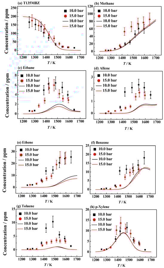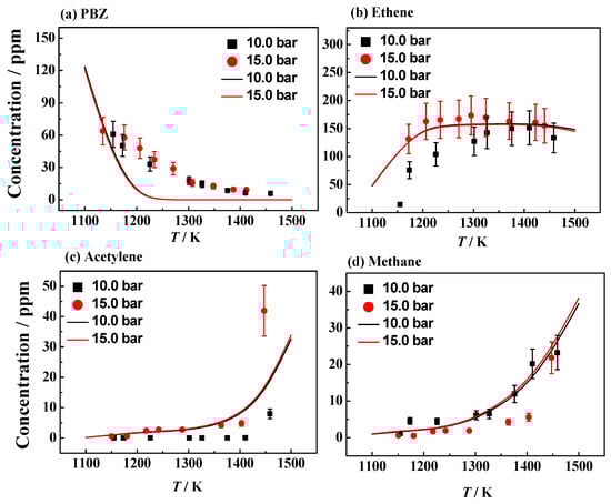 The temperature-concentration curve of the pyrolysis products of PBZ is shown in Figure 4. The results of species measured at two pressures are very close. Ethene and toluene are the main pyrolysis products, and their concentrations change with temperature, as shown in Figure 4b,f. The concentrations of ethene and toluene increase gradually with the change in temperature, and the peak temperature points are reached at 1400 K and 1350 K, respectively. The corresponding peak concentrations are 150 ppm and 110 ppm. Then, the concentrations gradually decrease with the increase in temperature. The concentrations of methane and acetylene increase with the increase in temperature. The concentration profiles of ethylbenzene and styrene with temperature are shown in Figure 4g,h. The variations in the concentrations of ethylbenzene and styrene as a function of temperature are similar, both of which gradually increase with the increase in temperature. After reaching the peak temperature point of the concentration, concentration decreases with the increase in pyrolysis temperature. Ethylbenzene reaches the peak concentration point at about 1200 K, and the maximum concentration is about 20 ppm. Styrene reaches its peak concentration around 1250 K, with a maximum concentration of about 24 ppm. The concentration profiles of benzene with temperature are shown in Figure 4e. It can be seen that the concentration gradually increases with the increase in temperature, and does not show a decreasing trend. The pyrolysis products of PBZ contain many soot precursors, among which ethene and toluene are the main pyrolysis products with concentrations of more than 100 ppm, and they can be generated stably at high temperatures. To sum up, at the studied conditions, pressure has minor effects on the pyrolysis species, while the species concentrations vary slightly with pressures changing from 10 to 15 bar. The trends in the pyrolysis products over the temperature range can be captured by the current model.