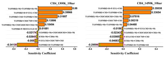 Similarly, based on experimental and simulation results, sensitivity analysis of T124MBZ and T135MBZ pyrolysis is conducted at 1300 K, 1450 K, and 1700 K with pressures of 10 and 15 bar. Figure 8 and Figure 9 show the sensitivity analysis results of T124MBZ at 10.0 bar.