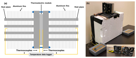 Based on the optimized conditions from the heat transfer analysis of the TEM with different boundary conditions, a 12 L refrigerator was constructed using HPs with a fan configured on both sides of the TEM. The HPs on the cold side were placed inside an insulated polystyrene foam box, as shown in Figure 1b. The size and construction of the refrigerator, which allow for direct comparisons with previous studies using a similar volume range [7,15,16,17,18,22,23], offer small-scale and portable solutions for medicine, food, or drink storage and transportation [1,4,5,7,23,30,31]. The air temperature inside the insulated box was measured using three thermocouples at different locations, and the average temperature was used in the analysis. The variation between these thermocouples was less than 1 K, which was within the experimental uncertainty. Two experimental conditions were tested: one inside a laboratory with controlled ambient air temperature and humidity and the other outdoors to examine the performance under various weather conditions during the day.