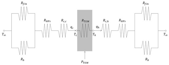 The thermal resistance network for the TEM with HPs on both sides is shown in Figure 2. includes all the resistances between and , which are the contact resistance on the hot side (), the HPs’ resistance (, the fin resistance (, where is the number of Al fins, is the fin efficiency, is the heat transfer coefficient, and is the fin surface area), and the convective resistance from the unfinned surfaces of the HPs’ condenser (, where is the unfinned surface area of the HPs’ condenser) [35,36]. Similarly, the includes all the resistances between and , which are the contact resistance on the cold side (), , , and [35,36]. is the conduction thermal resistance of the TEM and is the electric power supplied to the TEM [35]. includes the thermal resistances of the HPs, such as the evaporator and condenser, and the walls and wick thermal resistances [36,37].
