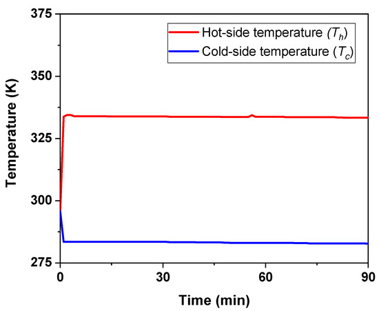 In Figure 3, and are shown for the TEM with HPs on the hot side and a cooling plate attached to the cold side. The temperatures stabilized rapidly after approximately one minute, with and values of 333.1 ± 0.4 K and 282.4 ± 0.3 K, respectively. The temperature difference between the TEM sides, ΔT = − , was 50.6 ± 0.7 K. For this configuration, the COP was 0.25 ± 0.01, and the values of and were 11.10 ± 0.13 W and 42.48 ± 0.09 W, respectively.