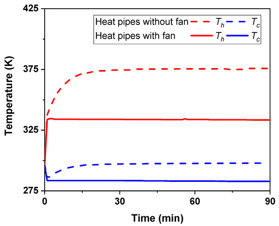 The cold-side temperature of the module stabilizes quickly for all cases, except when there is no fan connected to the HPs, as shown in Figure 4. This rapid cooling of the TEM is an advantage of TEM-based cooling systems to allow instant temperature control in response to transient heating [41]. In addition, the thermoelectric module offers various cold-side temperatures by adjusting the thermal boundary conditions on both sides. The required cold-side temperature and cooling rate can be obtained by selecting an appropriate heat sink connected to the TEMs, offering a flexible thermal design [13].