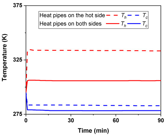 Hot- and cold-side temperatures for TEM with HPs on both sides and the hot side only.