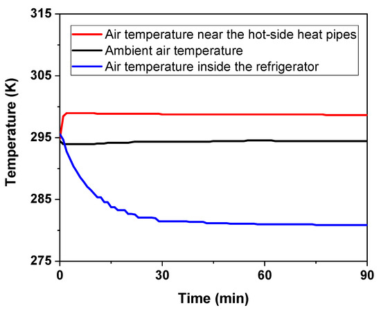 Although the remained constant at 304.8 ± 0.1 K for the indoor experiment, similarly to the results shown in Figure 5, the gradually decreased to 268.7 ± 0.4 K. The values of and remained at 20.73 ± 0.36 W and 61.34 ± 0.59 W, respectively. Hence, the refrigerator temperature gradually declined from 294.5 ± 0.2 K, which was the ambient temperature inside the laboratory, to a steady-state value of 281.6 ± 0.9 K within 30 min, as shown in Figure 6. In addition, the air temperature near the hot-side HPs increased from ambient temperature to a steady-state temperature of 298.6 ± 0.7 K in approximately two minutes, as shown in Figure 6.