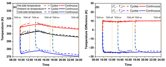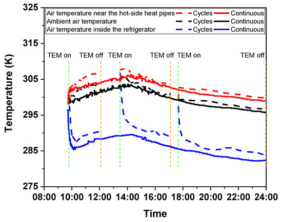 Moreover, an outdoor experiment was conducted to examine the performance of the TEM-based refrigerator placed outside the laboratory in a shaded area. During the test, the relative humidity ranged between 10% and 70%, and the ambient air temperature was between 297 and 306 K. Figure 7a shows the TEM sides and ambient air temperatures throughout the experiment, which was continuously operated. Another experiment was conducted in a cyclical fashion to examine TEM operation during start-up under different weather conditions.