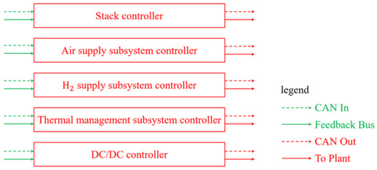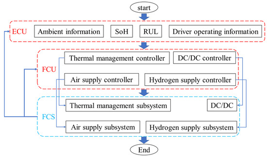 This section describes the models of the data monitoring, controller, actuators, and plant of the PEMFC system. Among them, the controller includes an electronic control unit (ECU) and a fuel cell control unit (FCU). The fuel cell system (FCS) includes actuators and plant. The schematic of the overall architecture of PEMFC system is shown in Figure 1, and a flowchart of the working principles is shown in Figure 2. The detailed contents are as follows.