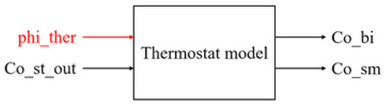 The input and output of the thermostat model: phi_ther is the opening of the thermostat; Co_st_out includes the coolant flow rate and temperature of the stack outlet; Co_bi/sm includes the coolant flow rates and temperatures of large/small cycles.