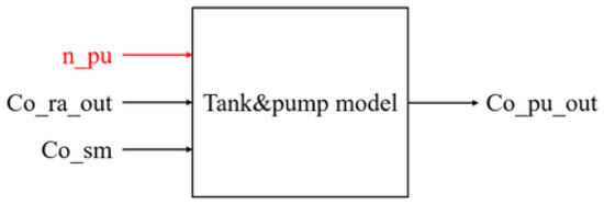 The input and output of the tank and pump model: n_pu is the pump speed; Co_pu_out includes the coolant flow rate and temperature of the pump outlet.