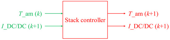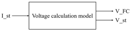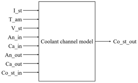 The coolant channel model was applied to calculate the stack temperature. The input and output of the coolant channel model are shown in Figure 8. The input of this model was the loading current of stack, temperature of ambient, voltage of stack, gas flow rate and temperature of the anode/cathode inlet and outlet, and coolant flow rate and temperature of the stack inlet. The output was the coolant flow rate and temperature of the stack outlet.